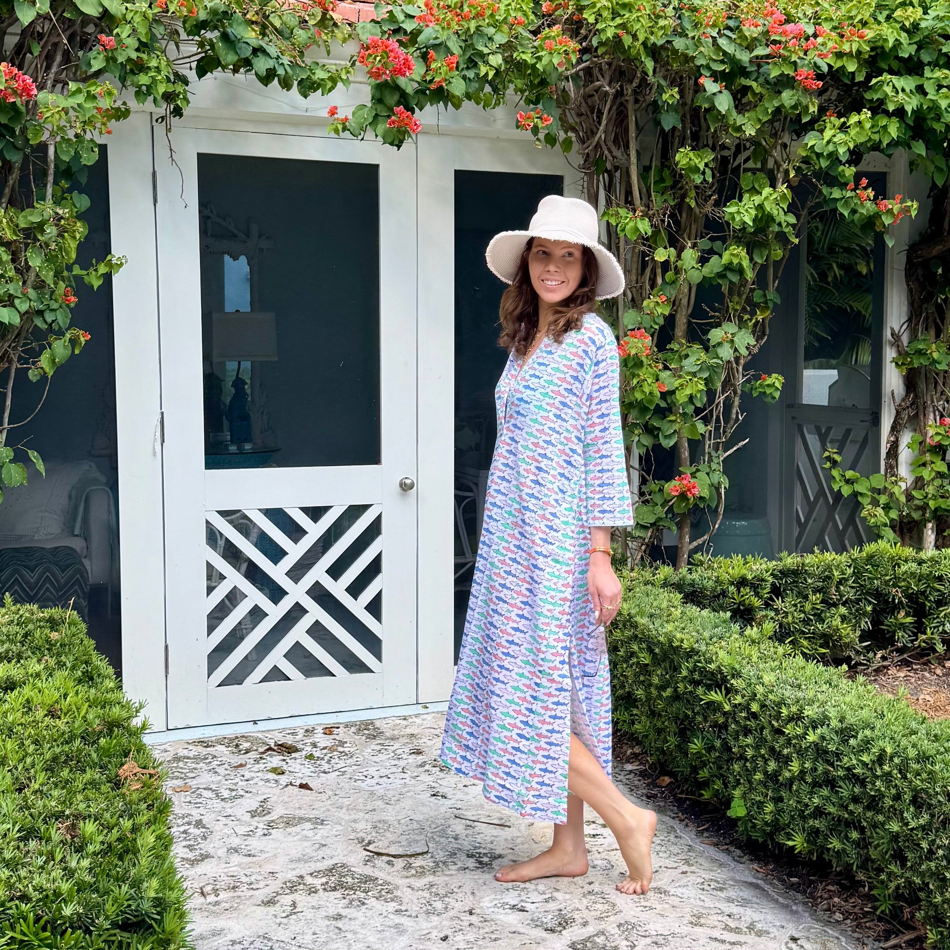 Days by the water is how we see you wearing your lightweight cotton cover up or maybe we have it all wrong and you’re cooking, running errands or just lounging at home. However you decide to wear your cover up wear it with a style, a smile and barefoot. It’s a pop over your head cover up with side slits, pockets and it’s that item in your closet that you will constantly reach for. Designed in Palm Beach, Fl for our love of nature and the whimsical island that we live and play on.