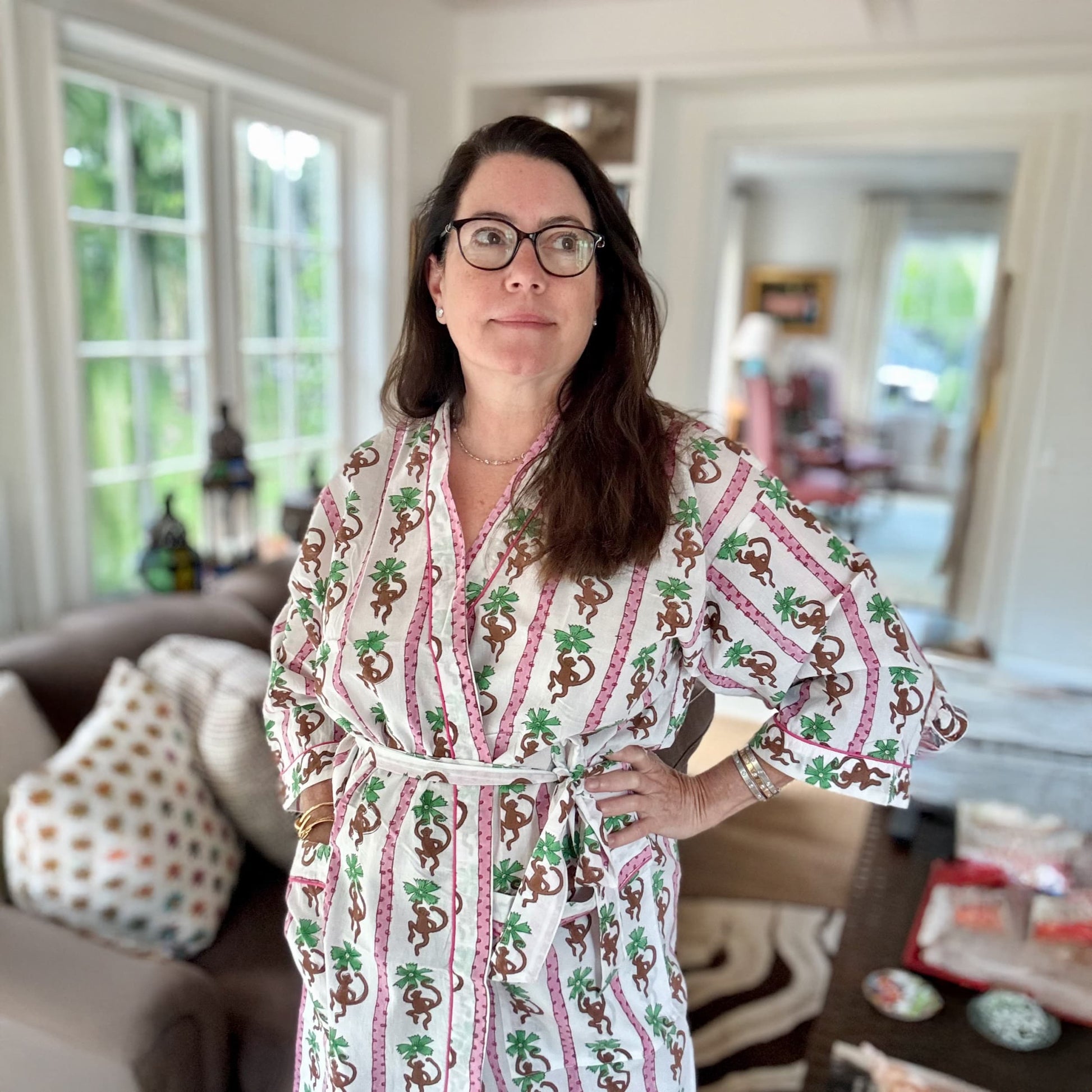 If you love monkey's like we do then you just might be a fan of this print. Who doesn't love hanging adorable monkeys, fresh pinks and green along with a fun stripe to let everyone know your mood. It's a whimsical print that I'm sure that you will gravitate to. Made up of a lightweight cotton, one size fits all, hand blocked with our unique design, pockets and a removable belt. Designed in in Palm Beach, Fl for our love of island living and the nature that surrounds us but crafted in India by our talented artisans. Hand wash separately in cold water before wearing.