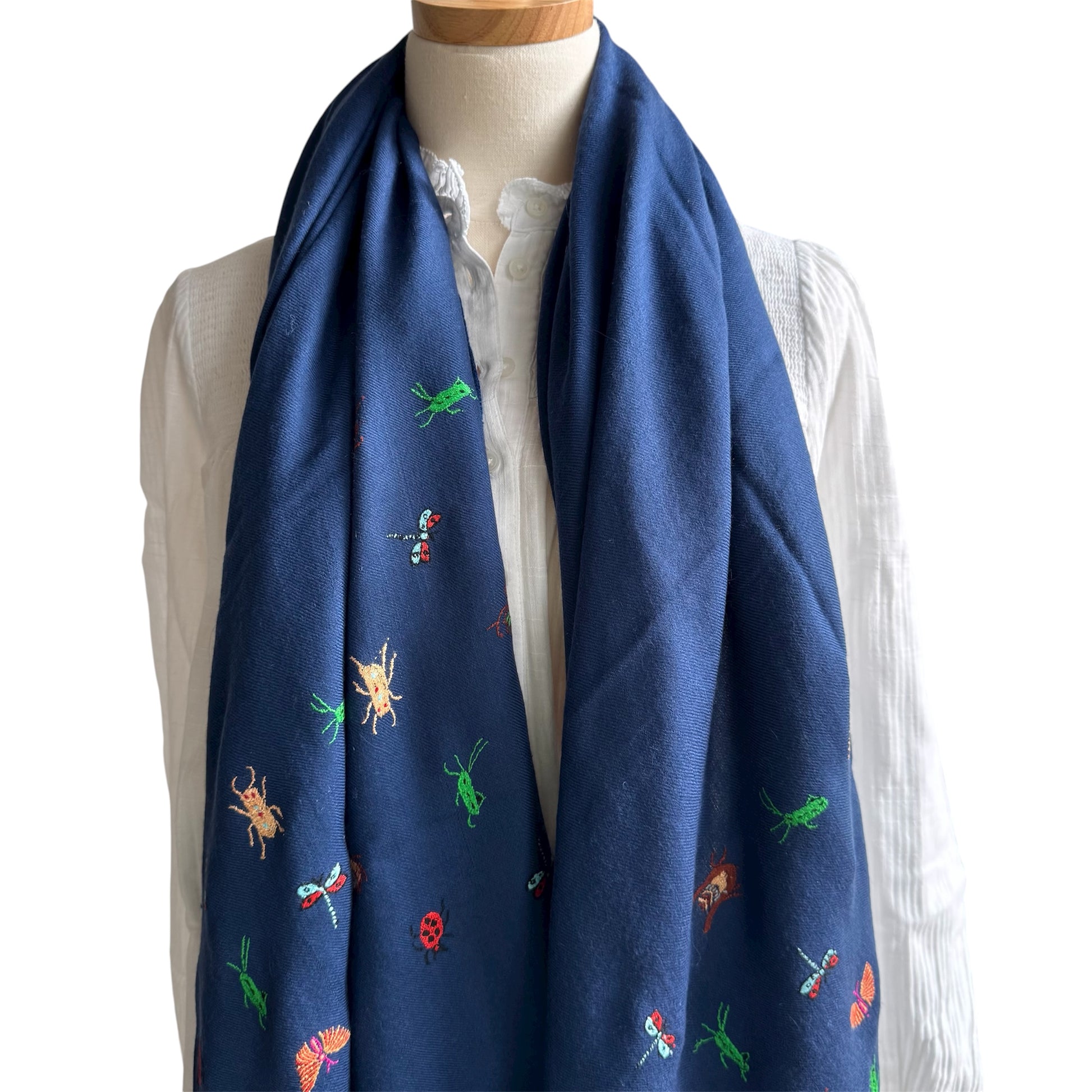 If you're a fan of gardening or you're a nature lover then we think that you will love our royal blue pashmina scattered with multi colored bugs along all the borders. A cheerful pashmina for sure even though it is crawling with bugs.So fun and lovely which will always be a topic of conversation. 100% hand made and signed by the artist who created it. Only one in stock. Dry Clean Only 100x200