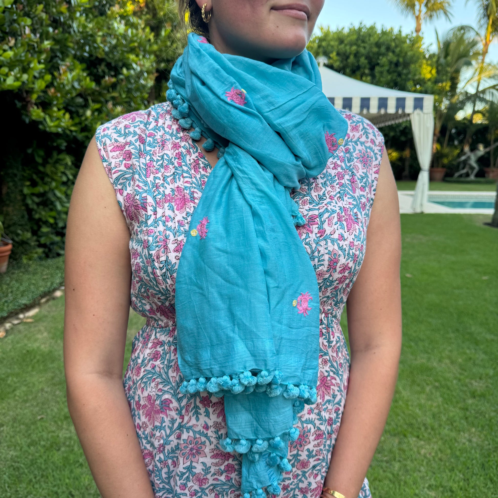 Calling all crab lovers! If you are that person then this cotton/silk hand embroidered Pom Pom wrap is for you. A deep Turquoise fabric with pink juggling crabs -what's not to love? A throw back to summer in a sense with days spent on the beach dodging crabs or eating them with a mallet. Hand wash cold water separately and hang to dry. Size 100x200