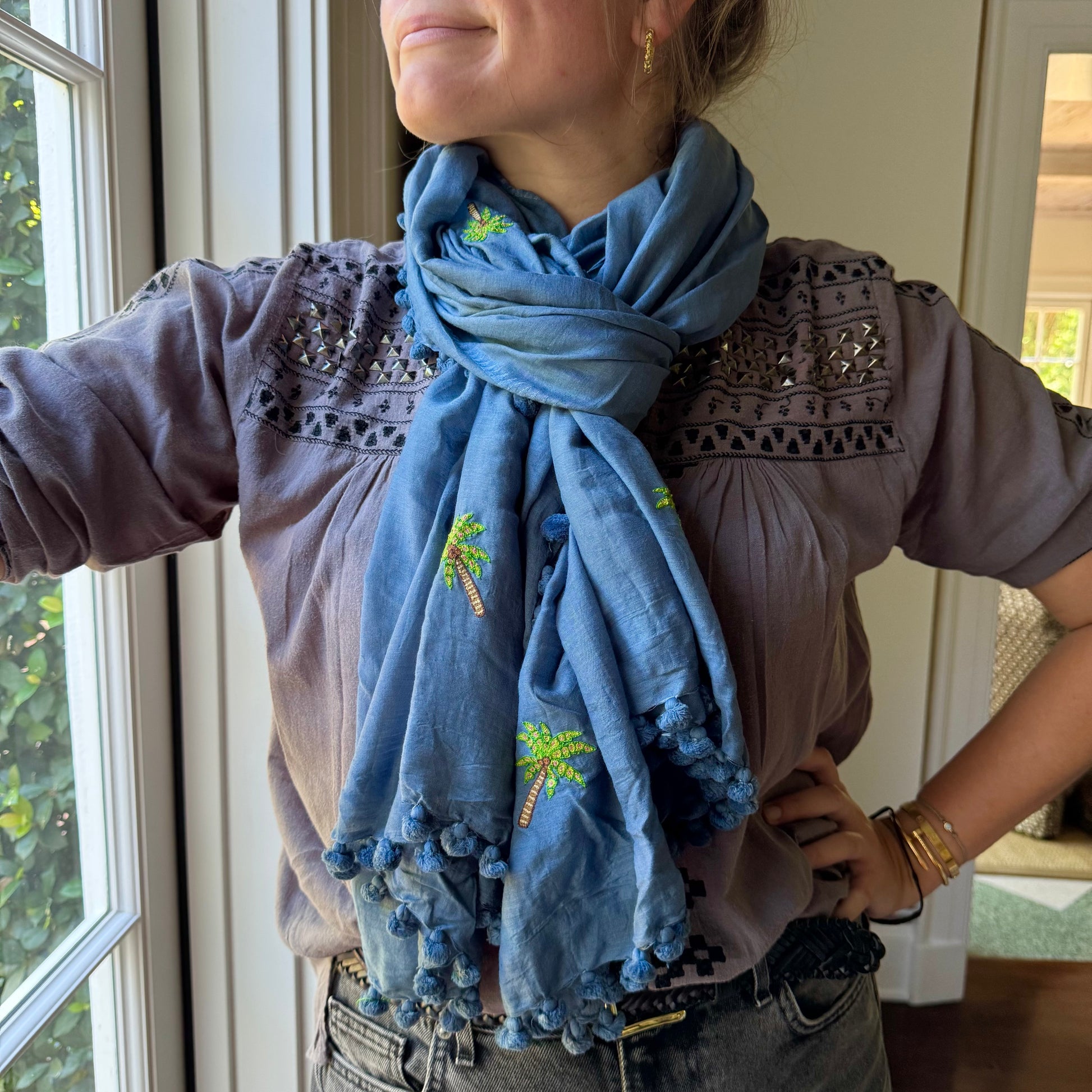 A denim navy blue with shades of green hand embroidered palm trees sets the tone of this Pom Pom wrap for sure. I travel with mine so I always have little bit of home with me wherever I go. Hand wash in cold water separately and hang dry. Size 100x200