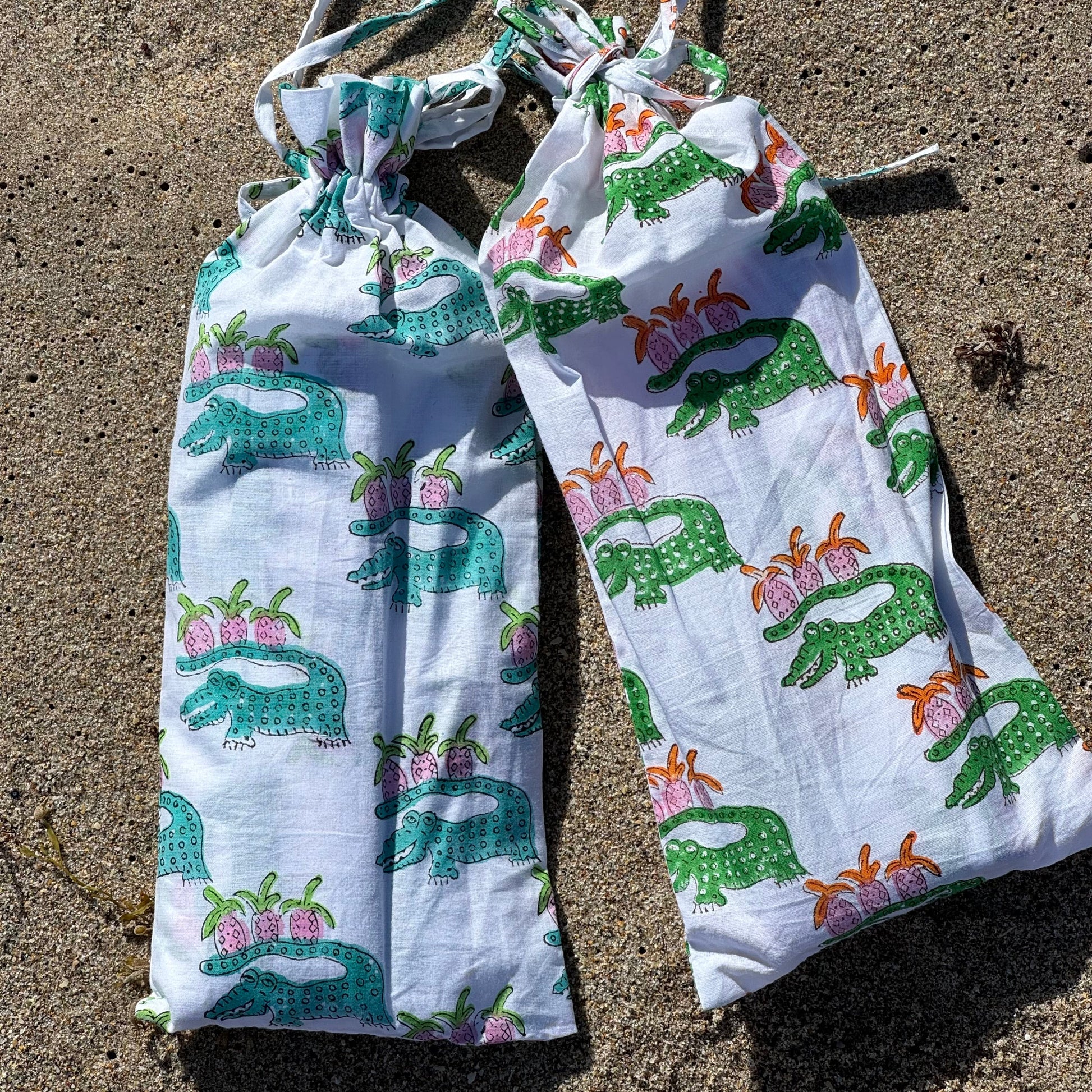 Green Alligators carting off pink pineapples is sure to transform your mood or anyone's mood for that matter. Add a day by the water to the mix and you are off to have a wonderful day. Hand wash in cold water separately before wearing.